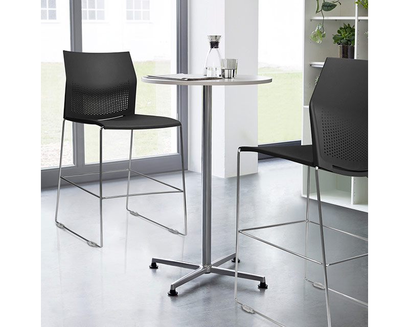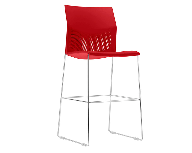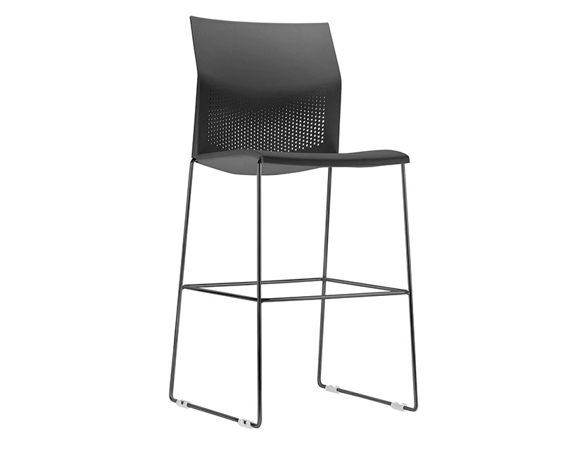 Banqueta alta com assento, contra assento e encosto injetados em polipropileno, estrutura trapézio fabricada em maciço cilíndrico de aço carbono Ø 7/16" (11,11 mm), com acabamento em pintura eletrostática à pó de cor preta ou cromada. Sapatas injetadas em polipropileno.