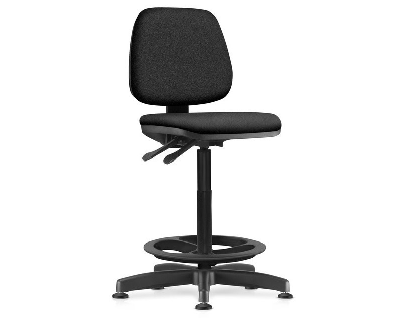 Espuma injetada, revestida em tecido ou courvin diversas cores, regulagem de altura a gás, regulagem no apoio de pé, regulagem de altura e inclinação do encosto, com capa plástica nas costas do encosto e embaixo do assento.