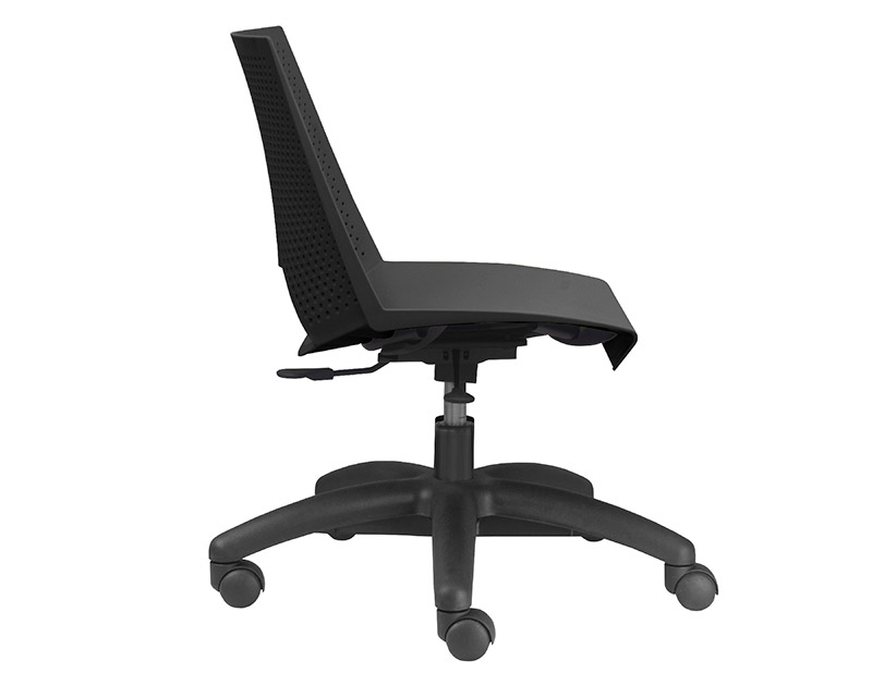 Cadeira giratória com assento e encosto monobloco, injetado em polipropileno, pistão à gás com curso de 115 mm para ajuste de altura do assento em conformidade com Norma Internacional DIN 4550. Base 05 patas injetada em nylon com fibra de vidro (resina de engenharia poliamida) e rodízios de duplo giro injetados em nylon.