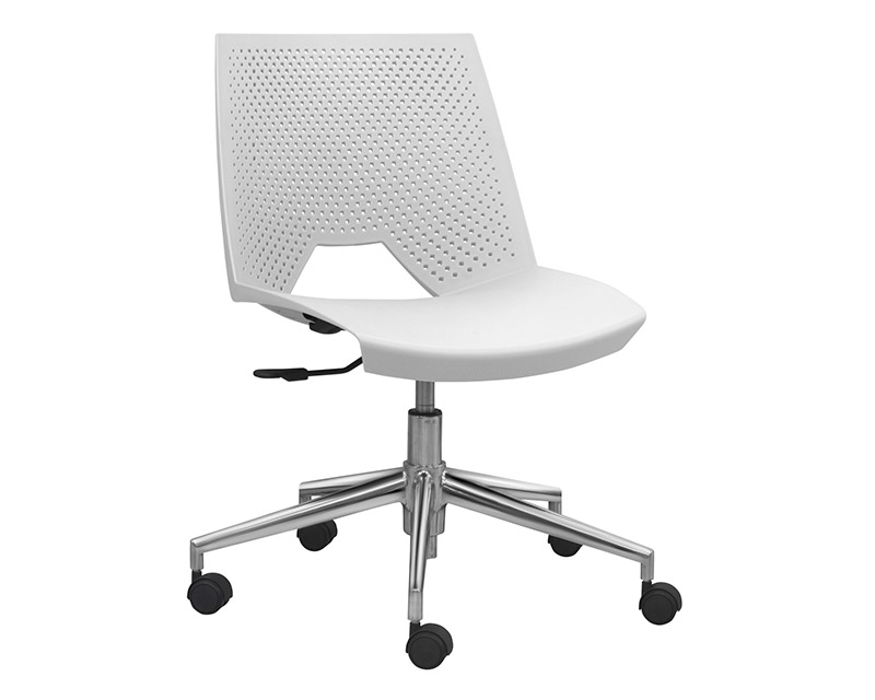 Cadeira giratória com assento e encosto monobloco, injetado em polipropileno, pistão à gás cromado, com curso de 115 mm para ajuste de altura do assento em conformidade com Norma Internacional DIN 4550. Base 05 patas do tipo piramidal, injetada em liga de alumínio com acabamento polido, rodízios de duplo giro injetados em nylon com pistas macias (PU).