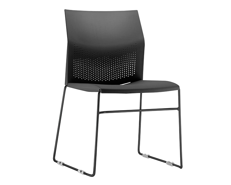 Cadeira de coletividade e uso múltiplo, empilhável, com assento, contra assento e encosto injetados em polipropileno, estrutura trapézio fabricada em maciço cilíndrico de aço carbono Ø 7/16" (11,11 mm), com acabamento em pintura eletrostática à pó de cor preta. Sapatas injetadas em polipropileno que permitem alinhamento e encaixe lateral entre cadeiras.