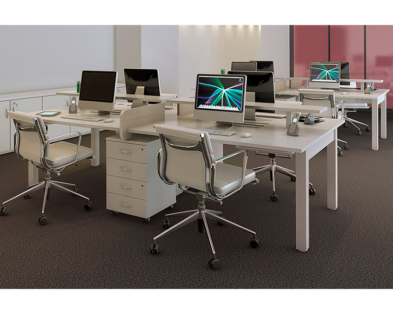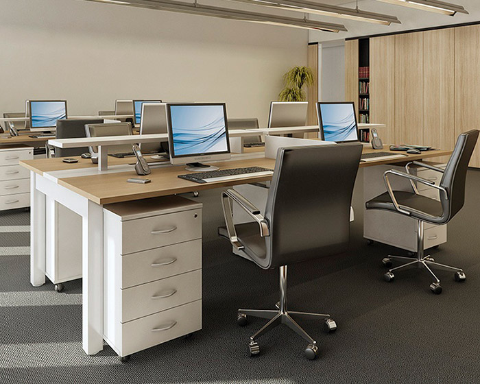 Estrutura em tubo de aço carbono 40x40 e 70x70 e chapas estampadas e dobradas. Com pintura eletrostática a pó com tratamento antiferruginoso. Pés laterais com subida de fiação, central com calha sacavel, travessas transversais de união dos pés laterais e central, com utilização como berço de fios.