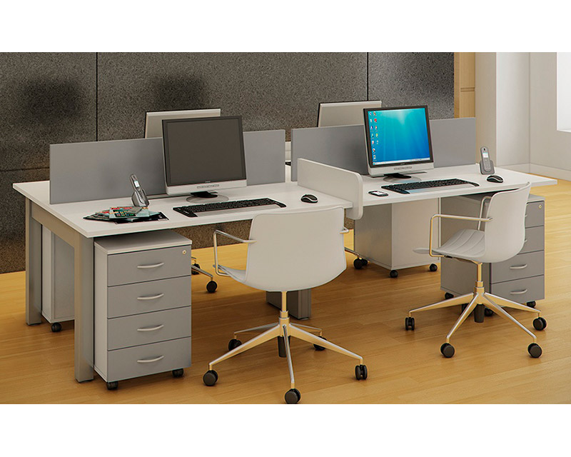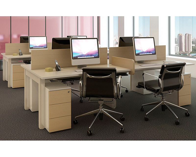 Estrutura em tubo de aço carbono 40x40 e 70x70 e chapas estampadas e dobradas. Com pintura eletrostática a pó com tratamento antiferruginoso. Pés laterais com subida de fiação, central com calha sacavel, travessas transversais de união dos pés laterais e central, com utilização como berço de fios.