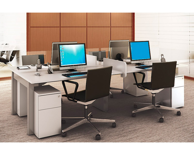 Estrutura em tubo de aço carbono 40x40 e 70x70 e chapas estampadas e dobradas. Com pintura eletrostática a pó com tratamento antiferruginoso. Pés laterais com subida de fiação, central com calha sacavel, travessas transversais de união dos pés laterais e central, com utilização como berço de fios.