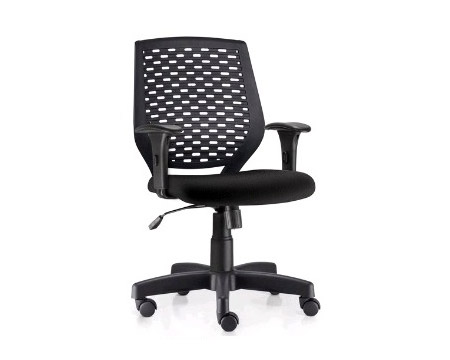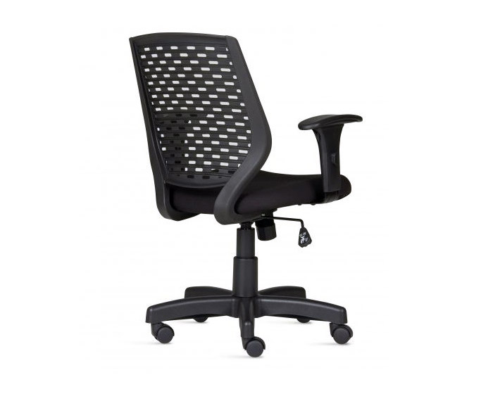 Encosto estruturado em quadro de aço carbono tubular revestido em tela flexível à base de poliester de cor preta.