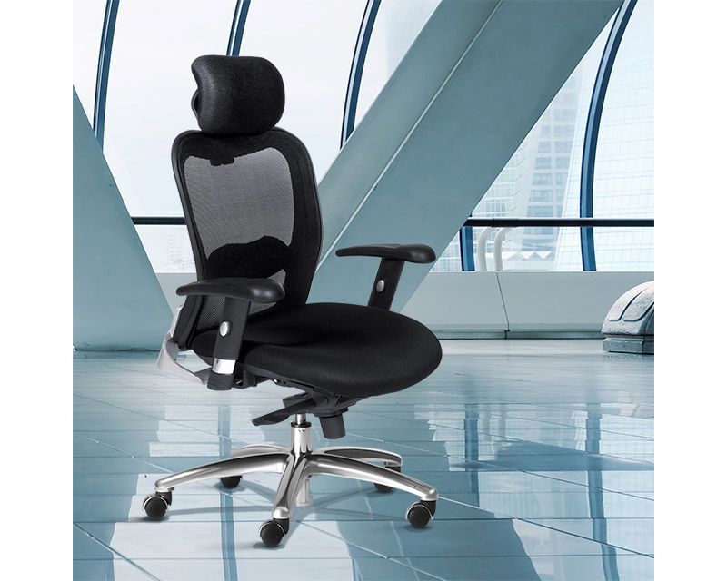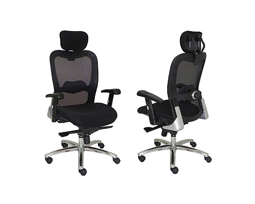 Encosto telado, assento com espuma injetada revestido em tecido, mecanismo sincronizado, regulagem no encosto, com encosto de cabeça, regulagem de altura a gás, com relax, estrutura cromada.